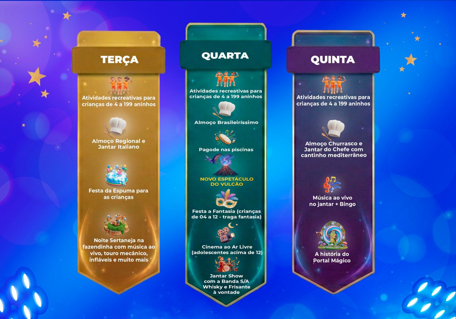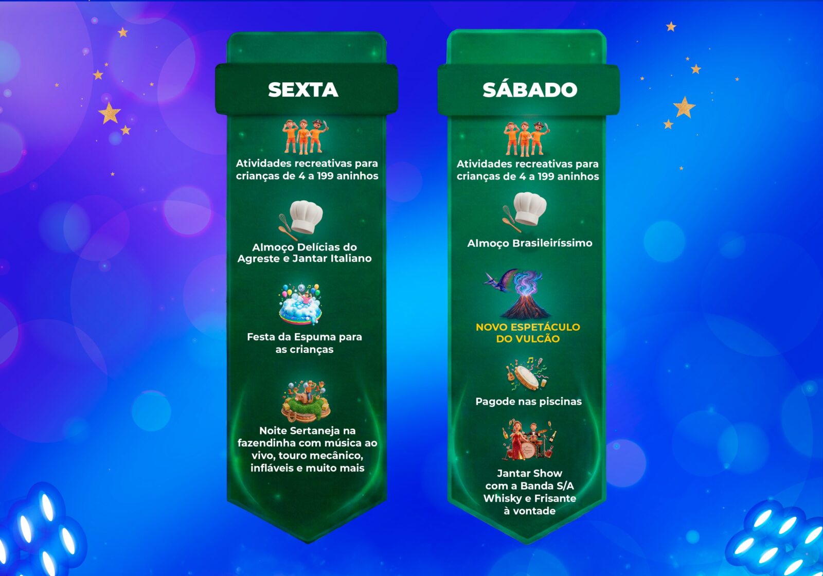 Em janeiro, a programação estará recheada de atividades especiais. De domingo a sábado, a recreação acompanha as crianças o dia inteiro, enquanto almoços temáticos e jantares exclusivos criam experiências gastronômicas que fazem parte desse universo encantado, do Churrasco ao Mineiro, do Italiano ao Gourmet.