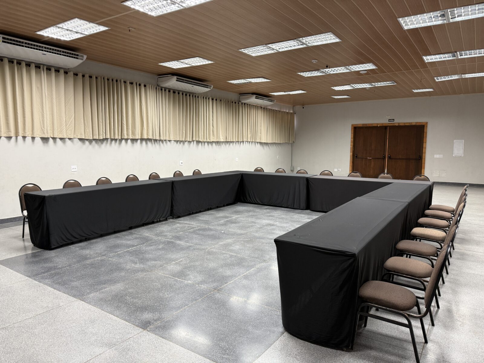 Espaço climatizado tendo um total de 350 metros quadrados com possibilidade de acomodar até 200 pessoas em formato auditório, área de apoio para café, sanitários masculino e feminino, toda instalação de som, conexões para vídeo e Flip Chart.