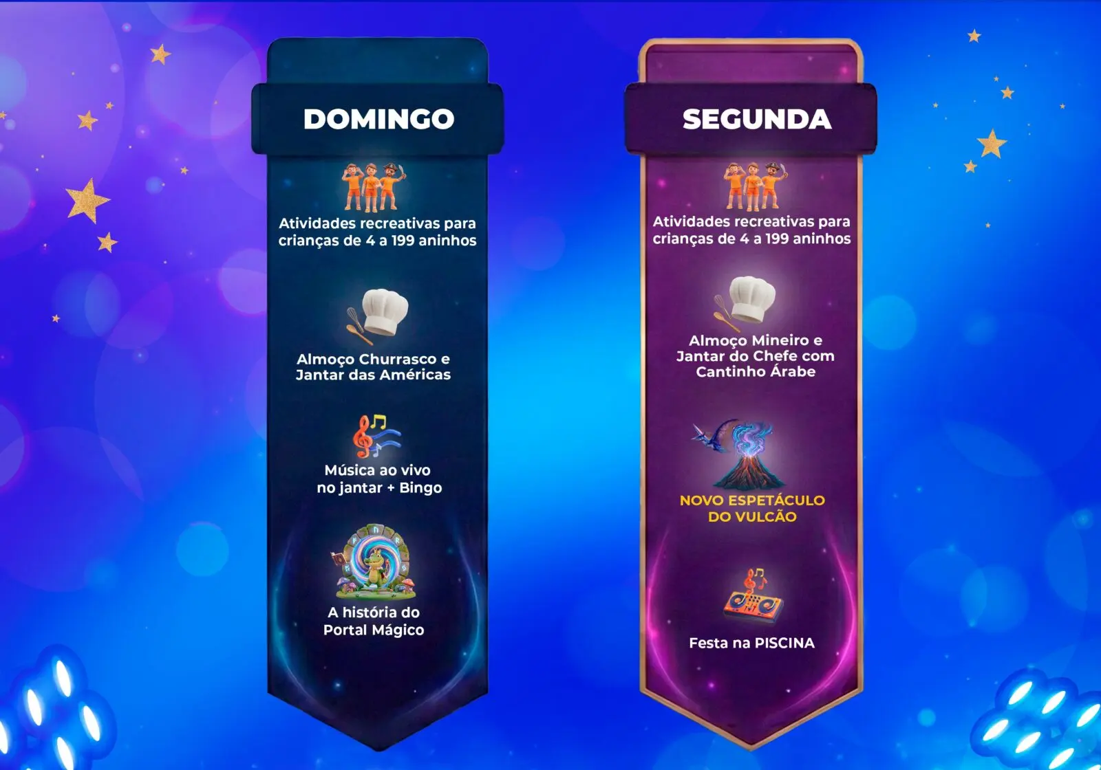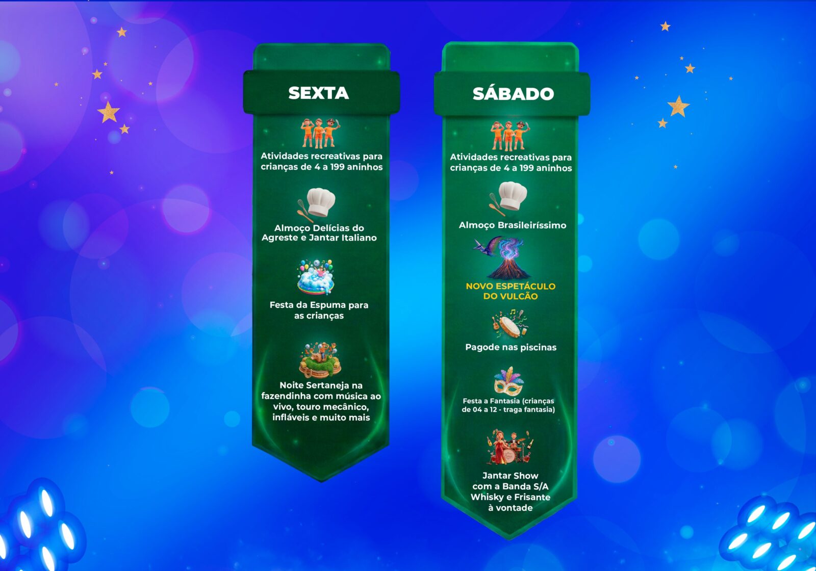 Em janeiro, a programação estará recheada de atividades especiais. De domingo a sábado, a recreação acompanha as crianças o dia inteiro, enquanto almoços temáticos e jantares exclusivos criam experiências gastronômicas que fazem parte desse universo encantado, do Churrasco ao Mineiro, do Italiano ao Gourmet.